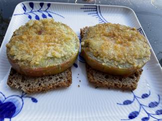 Superlækker og helt enkel frokost - hjemmebagt grovbrød og panerede, stegte skiver af Ananas Noire.