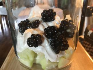 Dessert i sylteglas af græsk yoghurt rørt med sukker og vanille, Conferencepære i små tern og friske brombær.