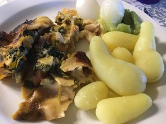 16. maj 2020 - 00:15 Billede Steens brændenælde-lasagne, nye kartofler og løg. Lasagnen var lagt sammen med bechamelsovs, bagte tomater fra fryseren, lidt ramsløg og kål - og en stor portion brændenælder.