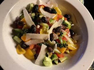 En frisk agurk sidst i oktober - så måtte der en sidste hjemmedyrket, græsk salat til. Dressingen er varemærket her: mynte, persille, hvidløg, citronsaft, olivenolie og en smule vand. Dressingen skal være helt grøn, pestoagtig. Desværre var fetaen spist - den blev erstattet af parmesan.
