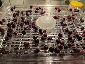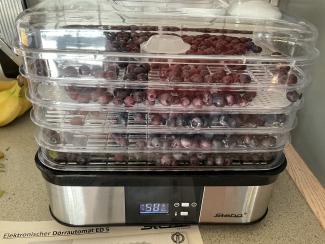 Der er foreløbig blevet 5 x 2 dl semidried. Bærrene fra de sidste 2 bakker er spredt ud i 4 bakker - og kører nu på 3 timer.
