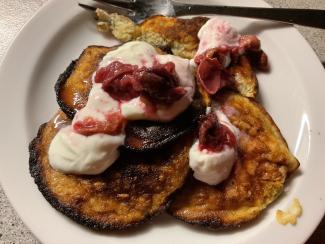 Tilbehøret er bl.a. hjemmelavet frugtsovs. I løbet af sommeren bliver der tit lidt frisk frugt til overs. Ofte 2-3 slags. Der går en del sukker til saft og syltetøj, men frugtsovsen er kun lige smagt til med sukker. Kog op med vanille, smag til med sukker og gem til vinterens mørke dage. Godt på yoghurt, grød eller i en dessert.