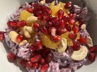 Coleslaw - efter Bitz’ idé. Cremen er lavet af 2% græsk yoghurt, citronsaft og sennep - så ret sund. Bitz foreslår appelsin og pekannødder. Det blev i stedet cashewnødder, 2 appelsiner i filet’er og så havde vi en rest granatæblekerner.