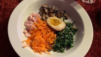 Her er fyldet gjort klar - og suppen med nudler kom på bordet, så man selv kunne øse op.