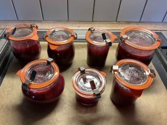 Hæld på glas og henkog: sæt i kold ovn, tænd på 140 grader. Når ovnen er varm, skal glassene have 30 min. Tjek, om de bobler let - giv ellers lidt ekstra tid.