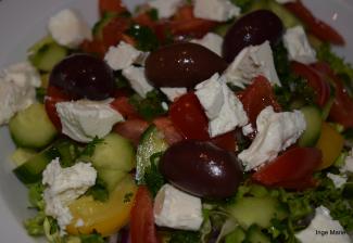 Salat, agurk, tomat, rødløg, peberfrugt, feta og oliven.