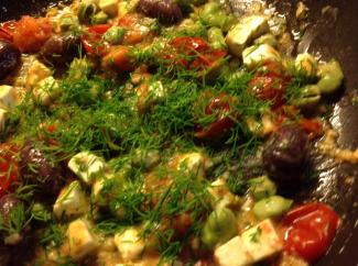Steg feta med. Derefter resten af ingredienserne, men gem lidt frisk dild, som drysses over ved servering.