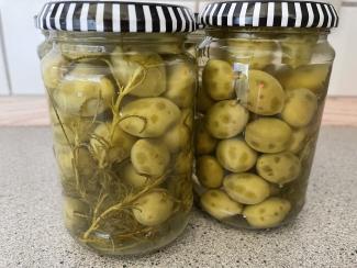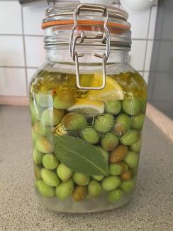 Tilsæt salt, hæld vand på, så det dækker. Hæld olivenolie på som låg øverst i krukken.
