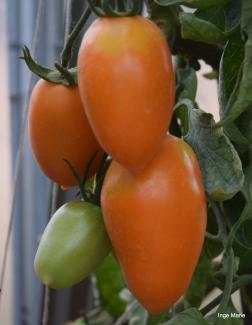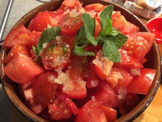 Tomater - gerne forskellige farver - med hel allehånde, merian, salt, peber, hvidløg og olivenolie.