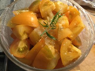 Orange og gule tomater - med frisk esdragon, hvidløg, salt, peber og olivenolie.