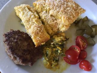 tilsæt 500 hakket kalvekød, 50 g havregryn, 2 tsk salt, friskkværnet peber, 2 store æg