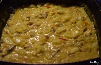 Tilsæt kokosmælk, salt og peber og kartofler i små tern. Lad det simre til en tyk sovs.