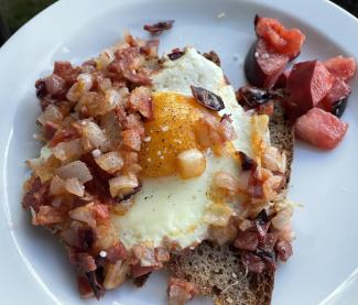 Hjemmebagt grovbrød, æg fra egne høns, stegte løg af egen avl og tern af Mar Azul-tomat.