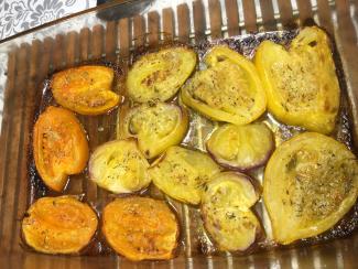 Tomaterne bages samtidig med gratinen, men kan sagtens tåle mere tid i ovnen. De bliver bare endnu mere koncentrerede i smagen.