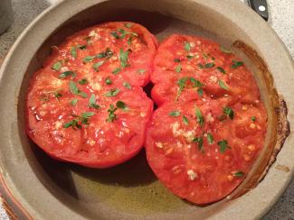 En af vores egne haner på langtidsstegning i ovnen og hjemmeavlet tilbehør: kartofler, Trombozino- skiver stegt på grillpande, ovnbagte tomater med hvidløg og timian - og til sidst en skive feta ovenpå.