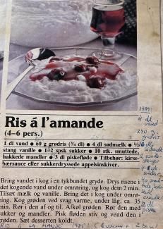 Den gode gamle opskrift fra “Karolines køkken” - godt slidt og plettet af mange års brug.