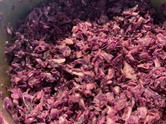 Snirttes fint og steges i lidt olivenolie. Smag til med salt, peber og lidt ribsgelé (eller æblejuice eller honning).
