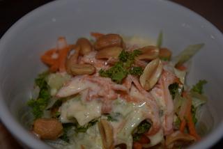 Salat af blandede grønsager, f.eks. iceberg, små spæde grønkålsblade (fra toppen af planten), groftrevet gulerod.