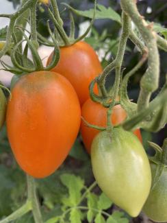 Tomaten stammer oprindelig fra en pose blandede frø. Den er supergod og frøstabil, så den dyrker vi hvert år - og den er også døbt her på matriklen.