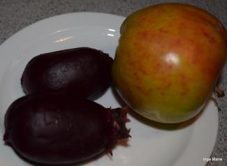 Her har jeg brugt det første modne Holsteiner Cox-æble og 2 små rødbeder, ca. 200 gram af hver.